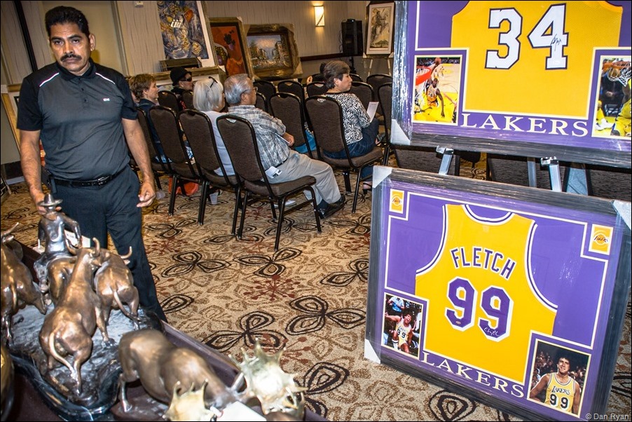 At the DoubleTree Hotel in Brisbane today, there was a seized asset/estate sale auction open to the public. Some legitimate art was on display, including bronzes by Remington and original drawings by heavy hitters like Picasso and Miró. Seems the seized assets came from drug dealers with decent taste. There was entertainment memorabilia as well, including an L.A. Lakers Fletch jersey signed by Chevy Chase. It’s clearly an humorous extension of the Fletch character’s basketball fantasy from the 1985 movie