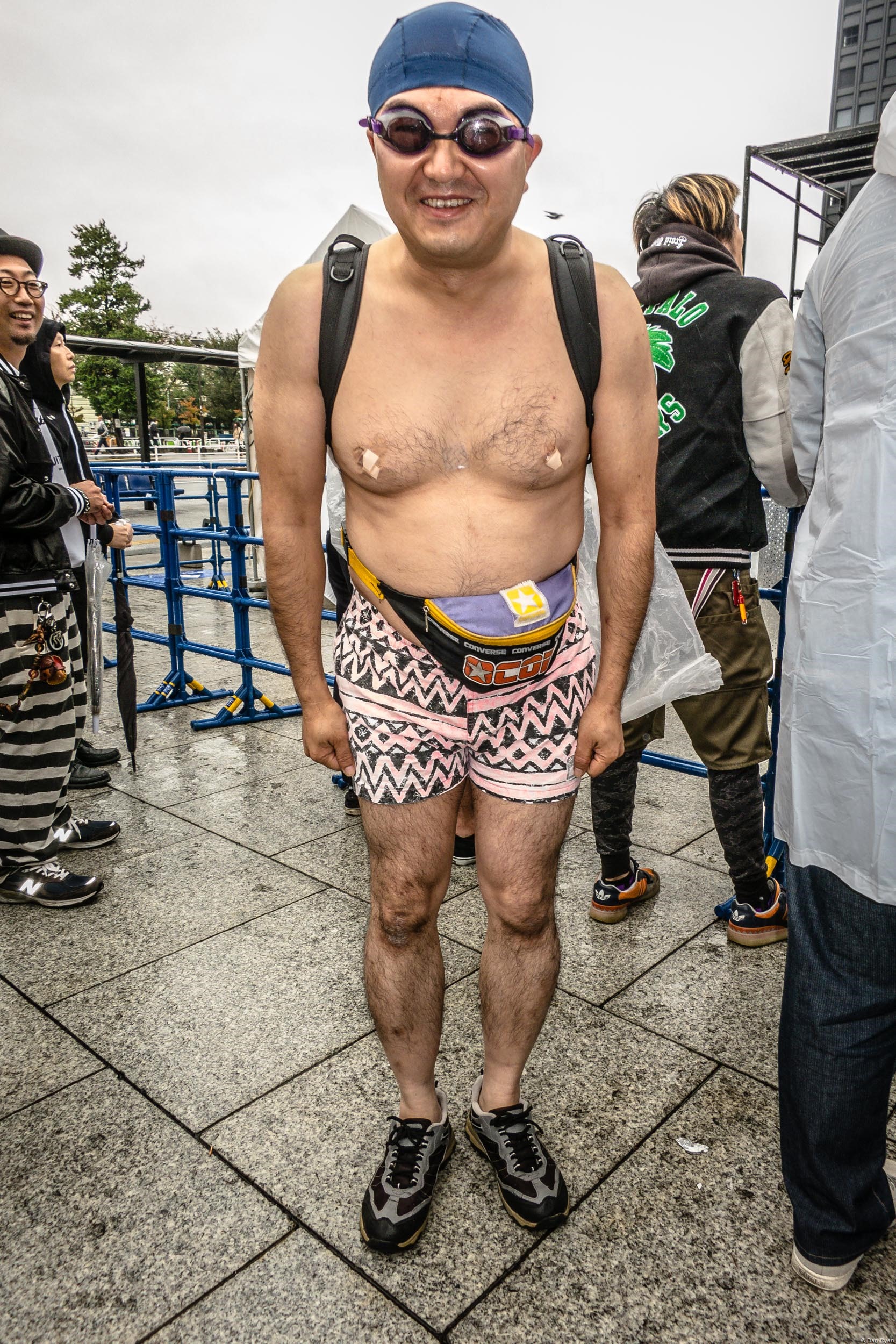 I figured out the scene I’d stumbled into was sponsored by a film festival and an agriculture company (maybe you can read far more of the poster in the second photo than I can), but I never did understand why this guy was standing in the crowd in swimming gear with plasters on his nipples in the rain on a chilly November day in Tokyo…