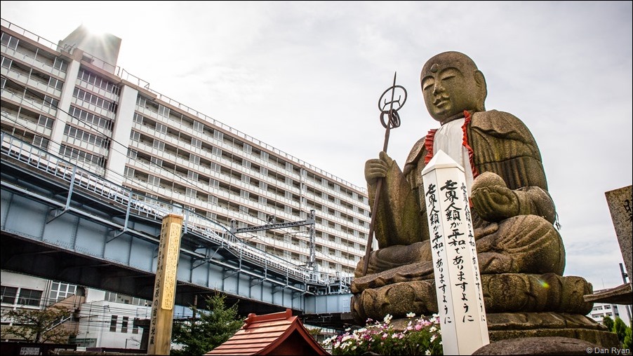Kozukappara is one of Tokyo’s most notorious Edo-era execution grounds. This beautiful jizō overlooks and guards the place. The grounds are a very short walk from the south end of Minami-senju Station, and so trains are constantly coming and going on elevated tracks on either side of Kozukappara. But despite its unquiet location, the jizō, in its wisdom and patience, keeps calm, unwavering watch, guarding the living from the dead and the dead from the living…