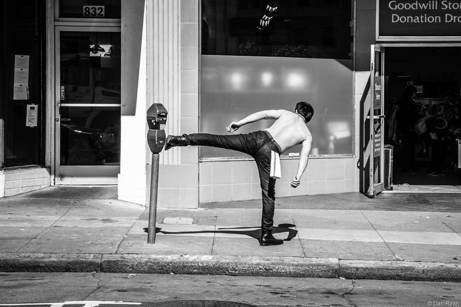 I was in San Francisco the other day, in front of the Goodwill Store on Clement Street between 9th and 10th Avenues. It was a warmer day than usual for early March, but even so it was surprising to see this guy with his shirt off in the middle of the day. He was unleashing a series of martial arts kicks upon an unresponsive parking meter…