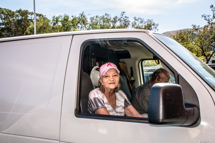 This is Brenda. She’s 72 and undergoing cancer chemotherapy for the first time in her life. She just started the chemo, that very morning in fact, but won’t know if it takes until some time this November. She’s happy to be getting treatment, because the cancer was making her very sick. She’s originally from North Carolina, but she and her man are moving to San Diego to settle while Brenda undergoes further cancer treatments. Her pink ribbon hat caught my eye, but her candor and aura of optimism and hope held my attention.