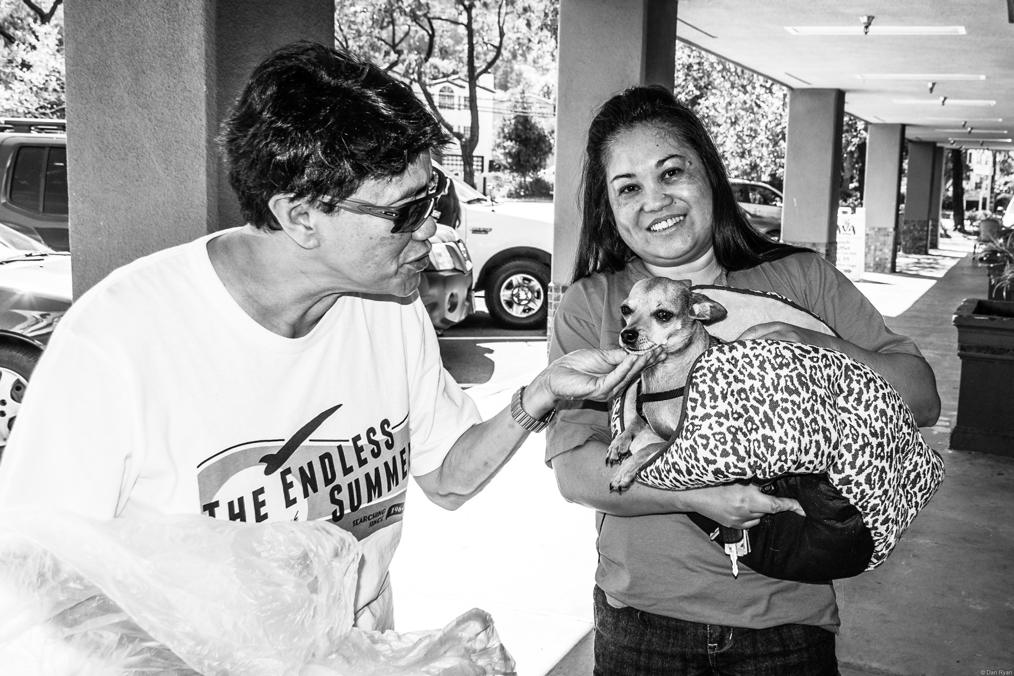 Miles the laid-back Chihuahua, in the arms of his primary human and receiving loads of adoration from his fan club on the left.